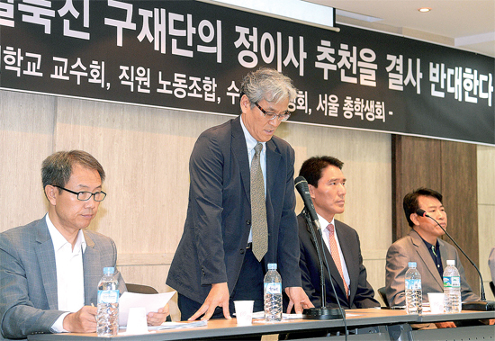 교수회와 총학생회, 직원 노동조합 등으로 구성된 비대위는 15일 경기대 수원캠퍼스에서 기자회견을 열고 “비리로 얼룩진 구 재단의 이사 추천을 결사반대한다”고 밝혔다.